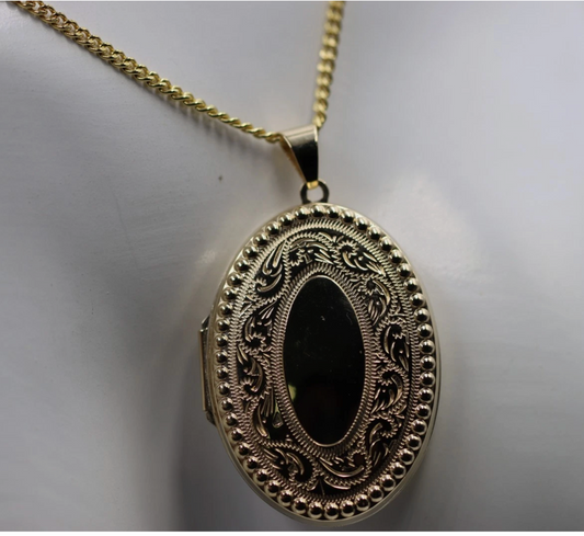 Genuine 9ct Yellow or Rose 375 Gold Engraved Border Oval Locket + 50cm Necklace Chain