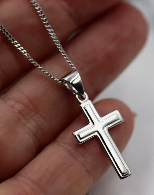Genuine Small New 9ct 9K White Gold Plain Cross Pendant + Necklace Chain 50cm