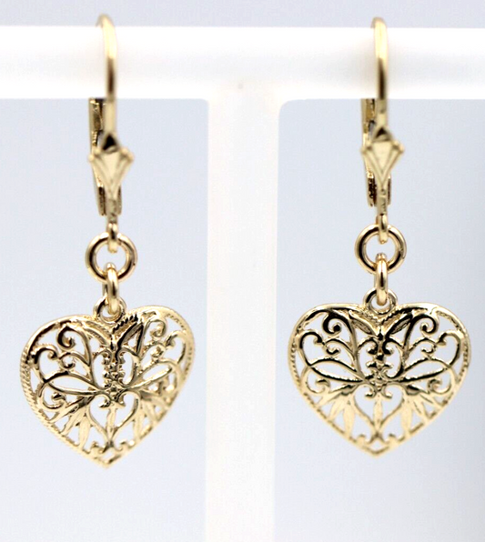 Genuine 9ct Yellow, Rose or White Gold Filigree Heart Drop Filigree Continental Hook Earrings