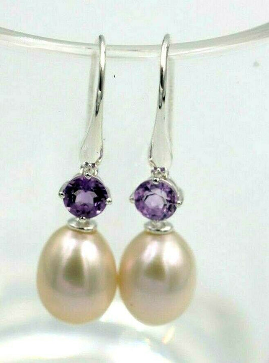 Sterling Silver 925 Oval Freshwater Cultured Pearl with 4-Claw 5mm Natural Amethyst Hook Earrings