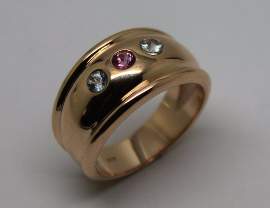 9ct 9k Full Solid Rose Gold Aquamarine + Pink Sapphire Thick Dome Ring 10mm Wide