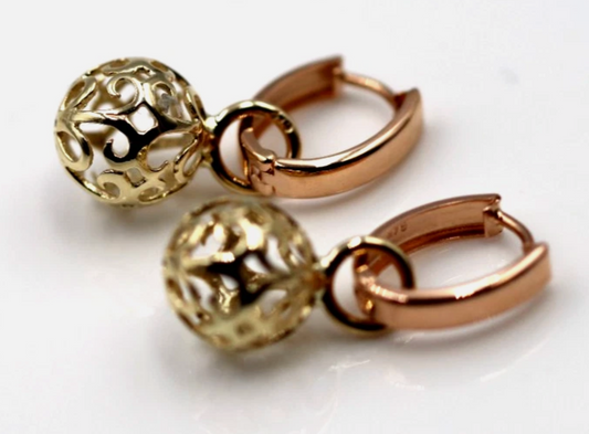 Genuine 9ct 9k 375 Rose + Yellow Gold Hoop 10mm Filigree Ball Huggies Earrings