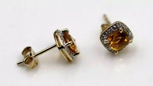 Genuine New 9ct Yellow Gold 9ct Gold diamond + Citrine Stud Earrings