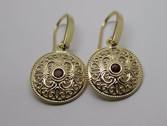 Kaedesigns 9ct Solid Yellow, Rose or White Gold Antique Red Garnet Filigree Drop Earrings