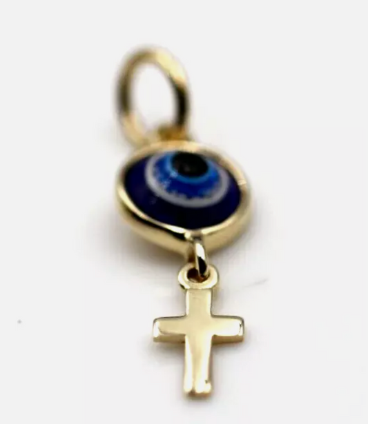 Genuine 9ct Yellow, Rose or White Gold Greek Mati Nazar Lucky 7mm Evil Eye + Cross Charm or Pendant