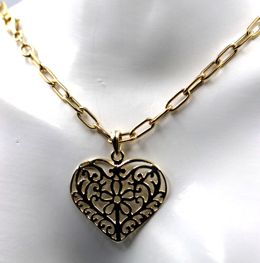 Genuine 9ct Yellow Gold Solid Filigree Heart Pendant & Necklace Chain-Free post