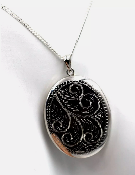 Sterling Silver 925 Oval Engraved Pendant Locket 2 photos + Necklace