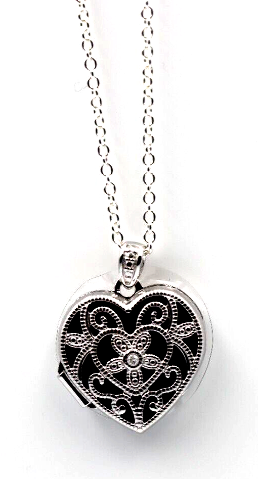 Genuine Sterling Silver Diamond Set Filigree Heart Locket + Necklace