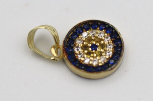 Genuine 14ct Yellow Gold CZ Small Round Greek Mati Evil Eye Turquoise Pendant Reversible