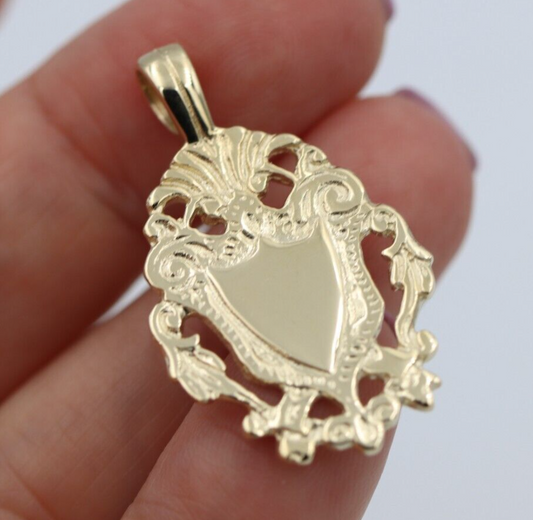Genuine Solid 9K 9ct Yellow, Rose or White Gold Filigree Shield FOB Pendant