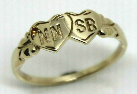 Genuine 9ct 9k Yellow, Rose or White Gold Double Heart Yellow Topaz Birthstone Signet Ring + Engraving