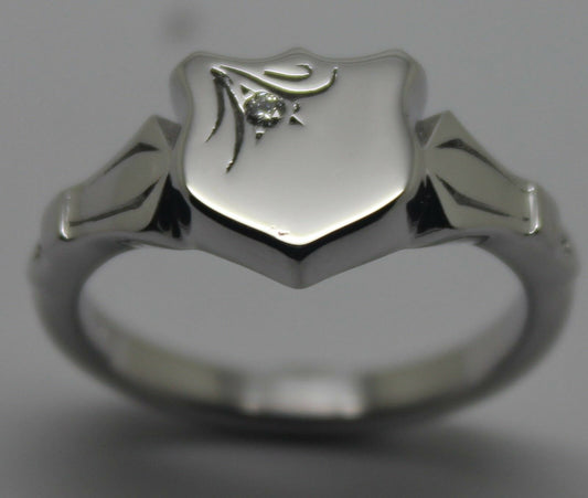 Genuine Solid 9ct 9kt White Gold Shield Signet Ring Set With A Genuine Diamond