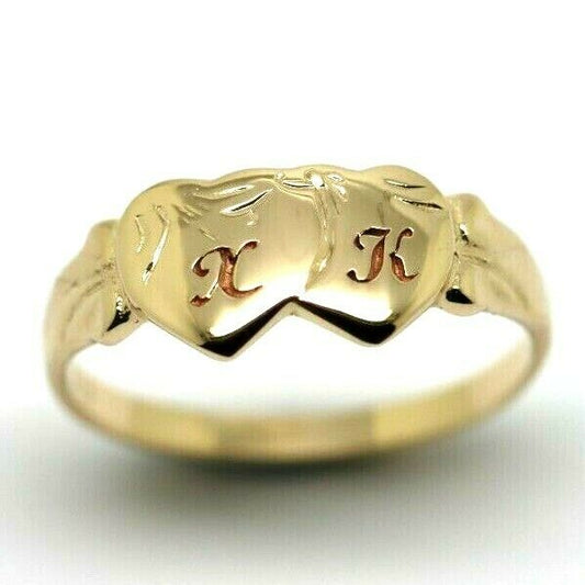 Genuine 9ct 9k Yellow, Rose or White Gold Double Heart Signet Ring + Engraving 2 initials