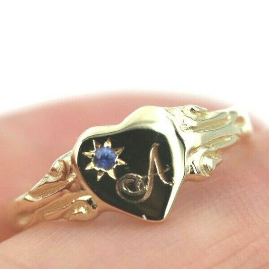 Size K 9ct Yellow, Rose or White Gold Heart Signet ring Set Blue Sapphire + Engraving 1 initial