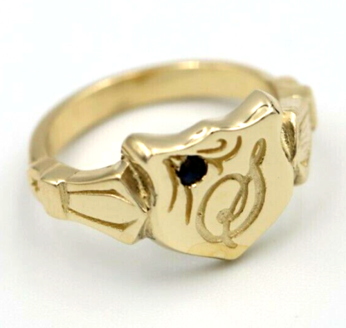 Solid Australian Sapphire 9ct Yellow Gold Shield Signet Ring Size K Engraved with Letter S