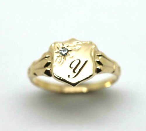 Genuine 9ct Small Yellow, Rose or White Gold Cubic Zirconia Shield Signet Ring Engraving of one initial