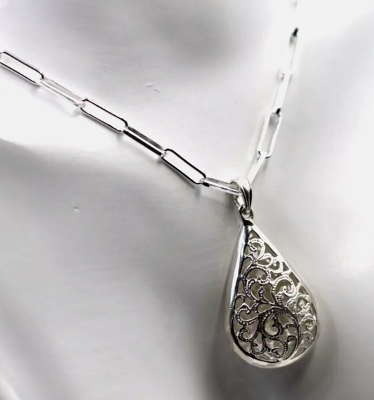 Sterling Silver 925 Paperclip Necklace + Filigree Teardrop Pendant
