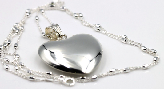 Genuine Sterling Silver 73cm Ball Necklace & Large Heart Pendant