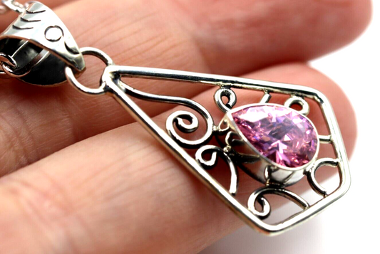 Sterling Silver 925 Pink Sapphire Swirl Pendant + 55cm Heavy Curb Chain