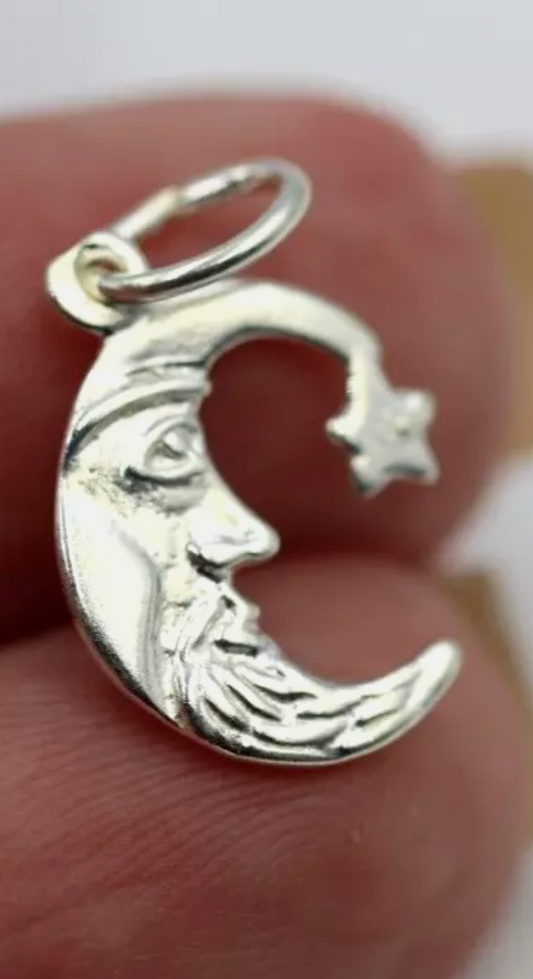 Genuine 925 Sterling Silver Crescent Half Moon, Sun + Star Pendant