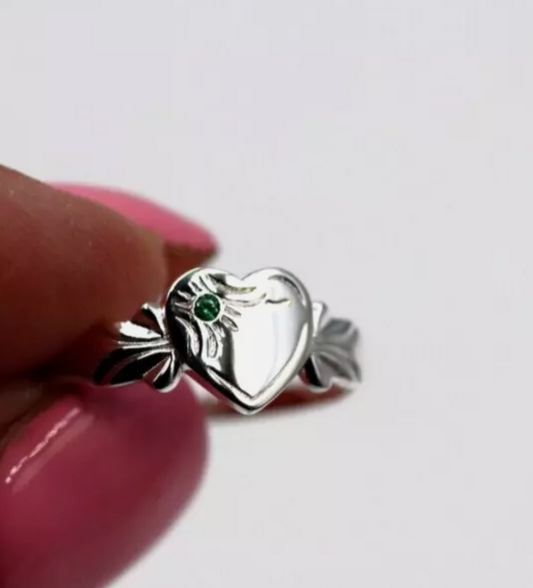 Sterling Silver 925 May Birthstone Heart Signet Ring + Emerald CZ