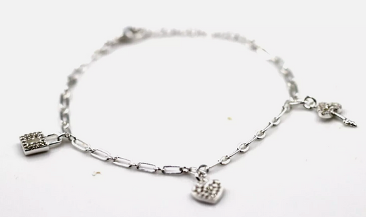 Sterling Silver 925 19cm Charm Paperclip Bracelet White Cz Padlock, Heart & Key