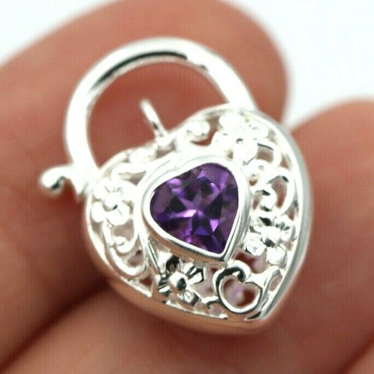 Sterling Silver 925 Filigree Natural Amethyst Filigree Heart Padlock 15mm