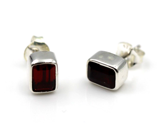 Genuine Sterling Silver 925 Garnet Bezel Rectangle Stud Earrings