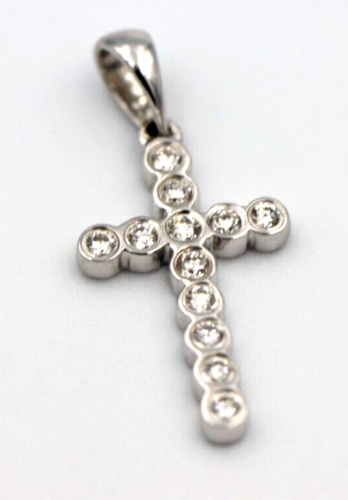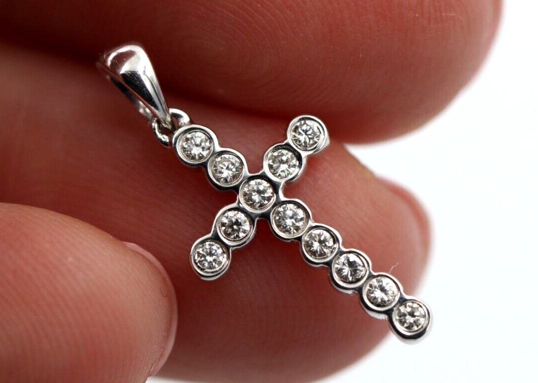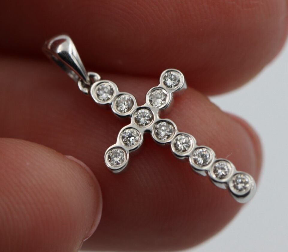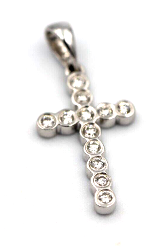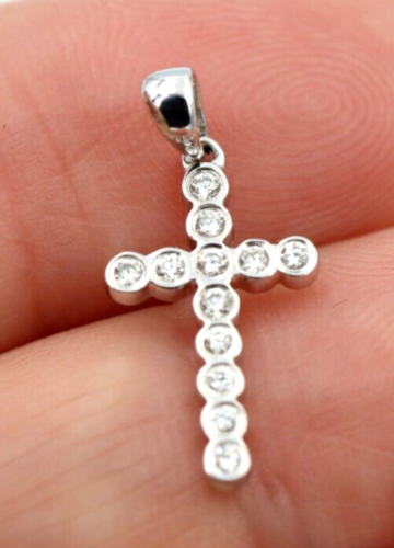 0.15cts Bezel Set 18ct 750 White Gold Round Diamond Cross Pendant -Free post
