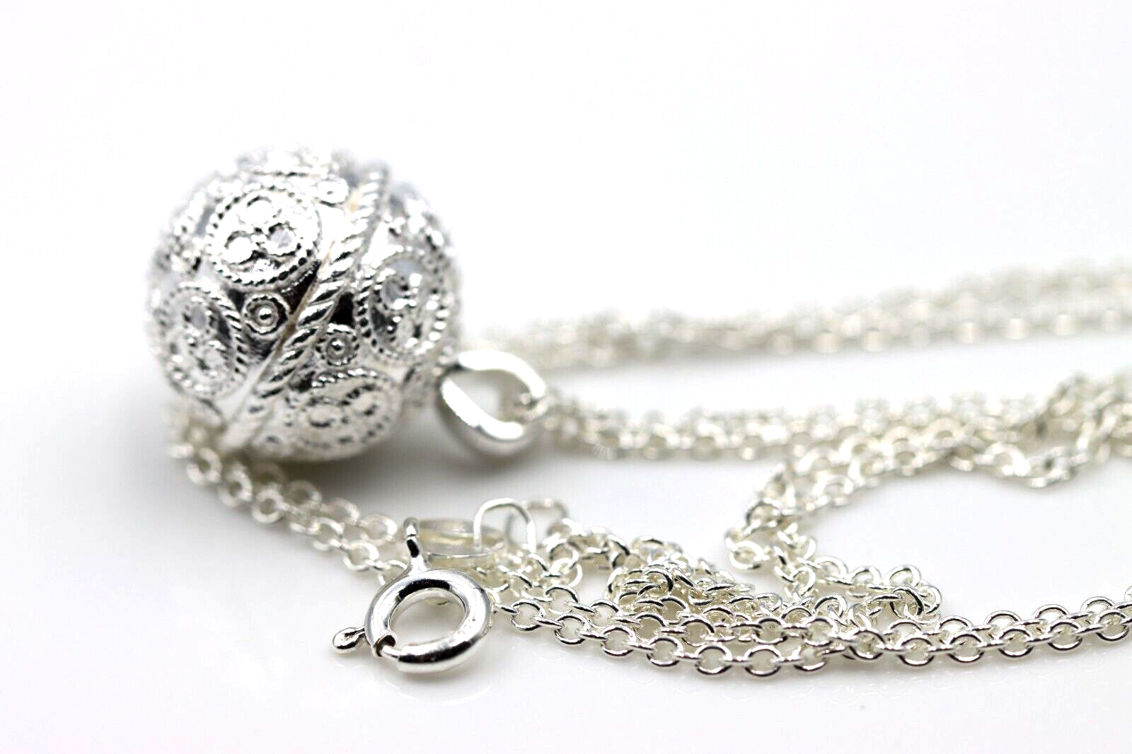 Genuine Sterling Silver Lace Pattern Ball Memorial Pendant with Screw Opening Bail + Necklace