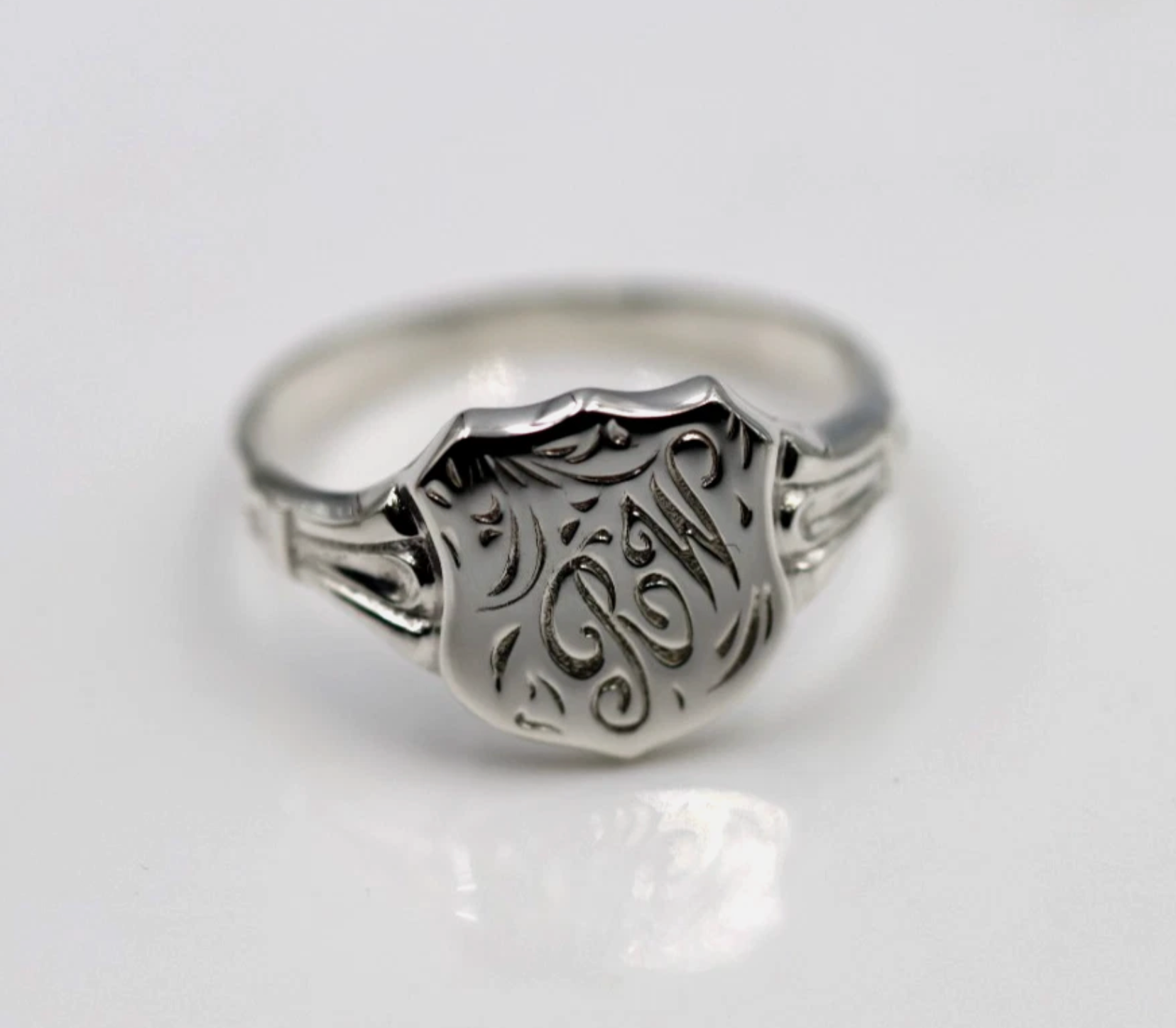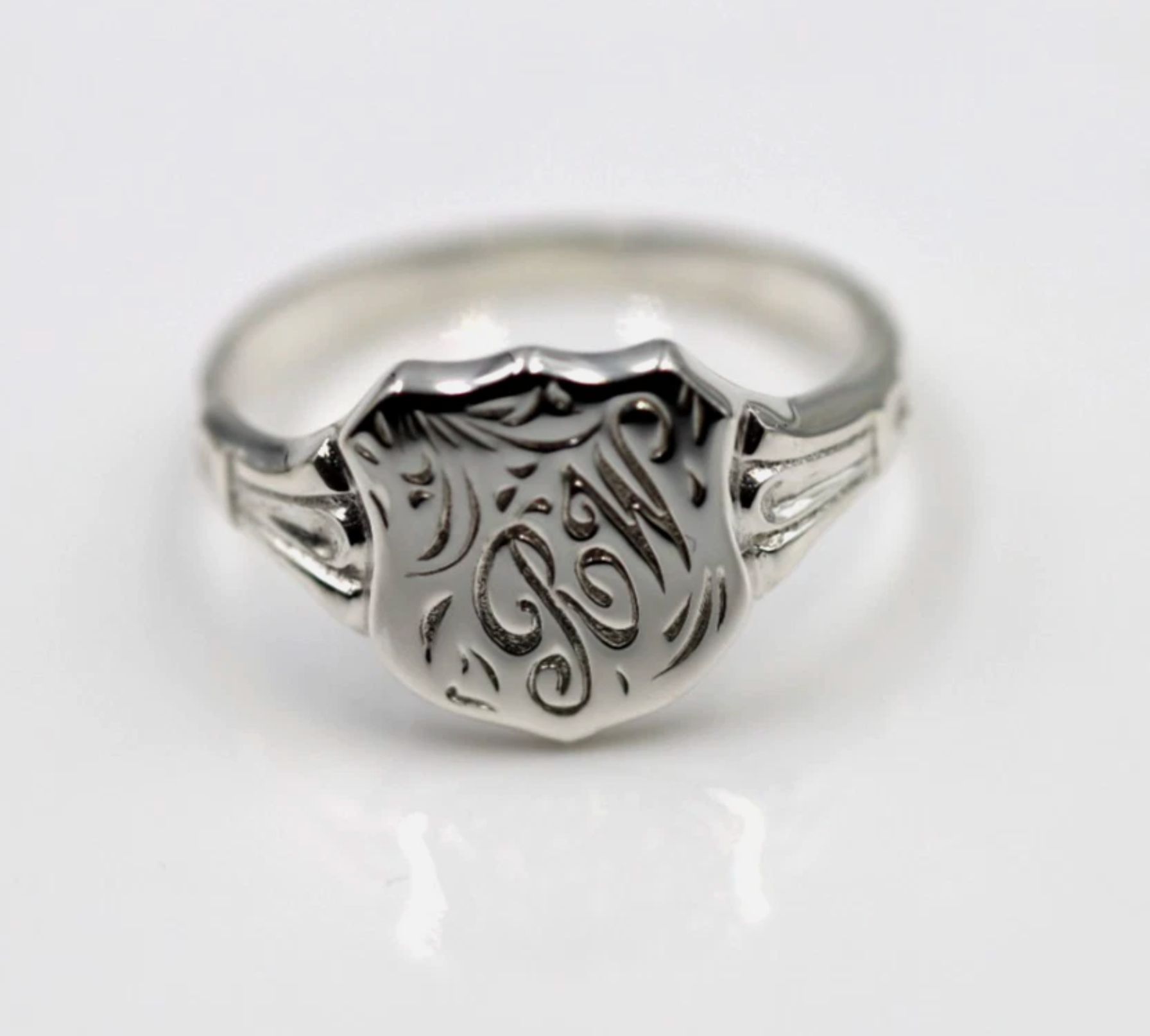 1.2cm x 1.1cm size of shield width of band 2mm Choose your ring size Price includes engraving of 2 initials |
